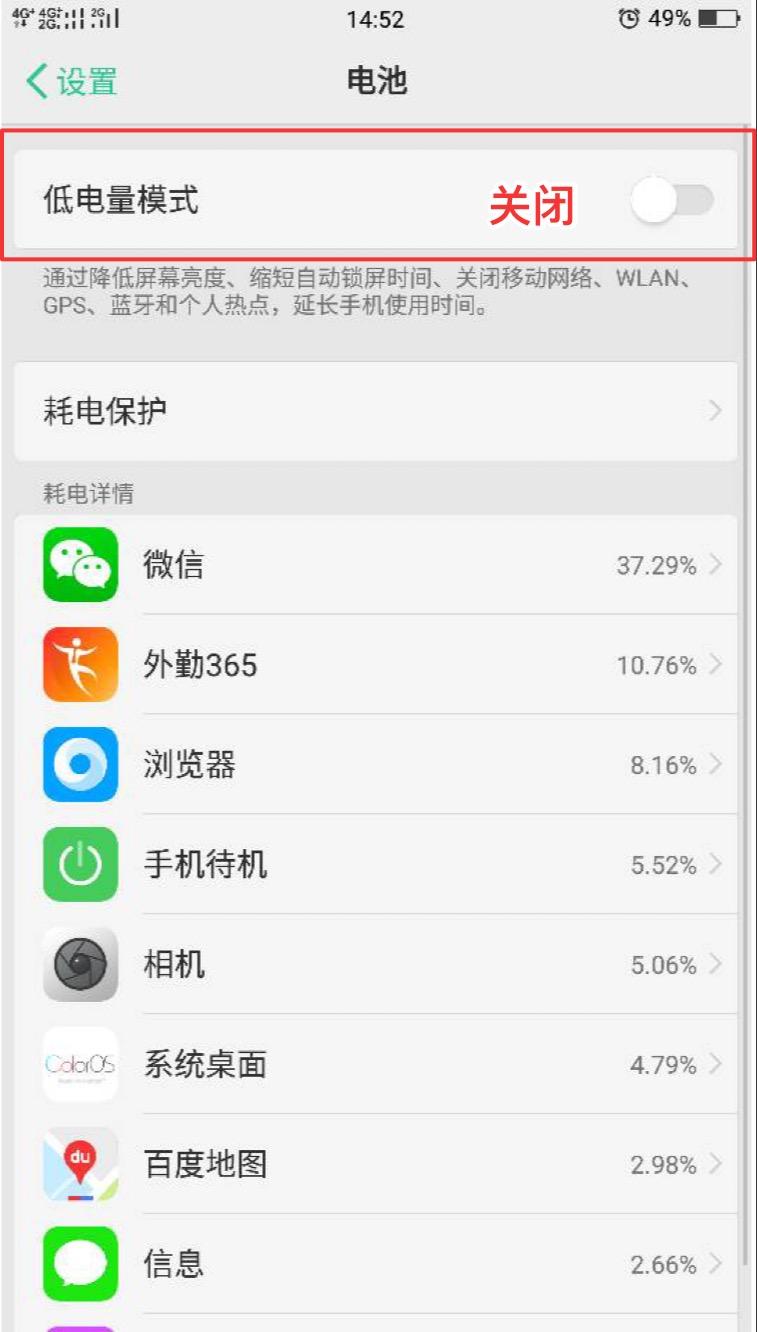 三.手机设置--电池--关闭低电量模式