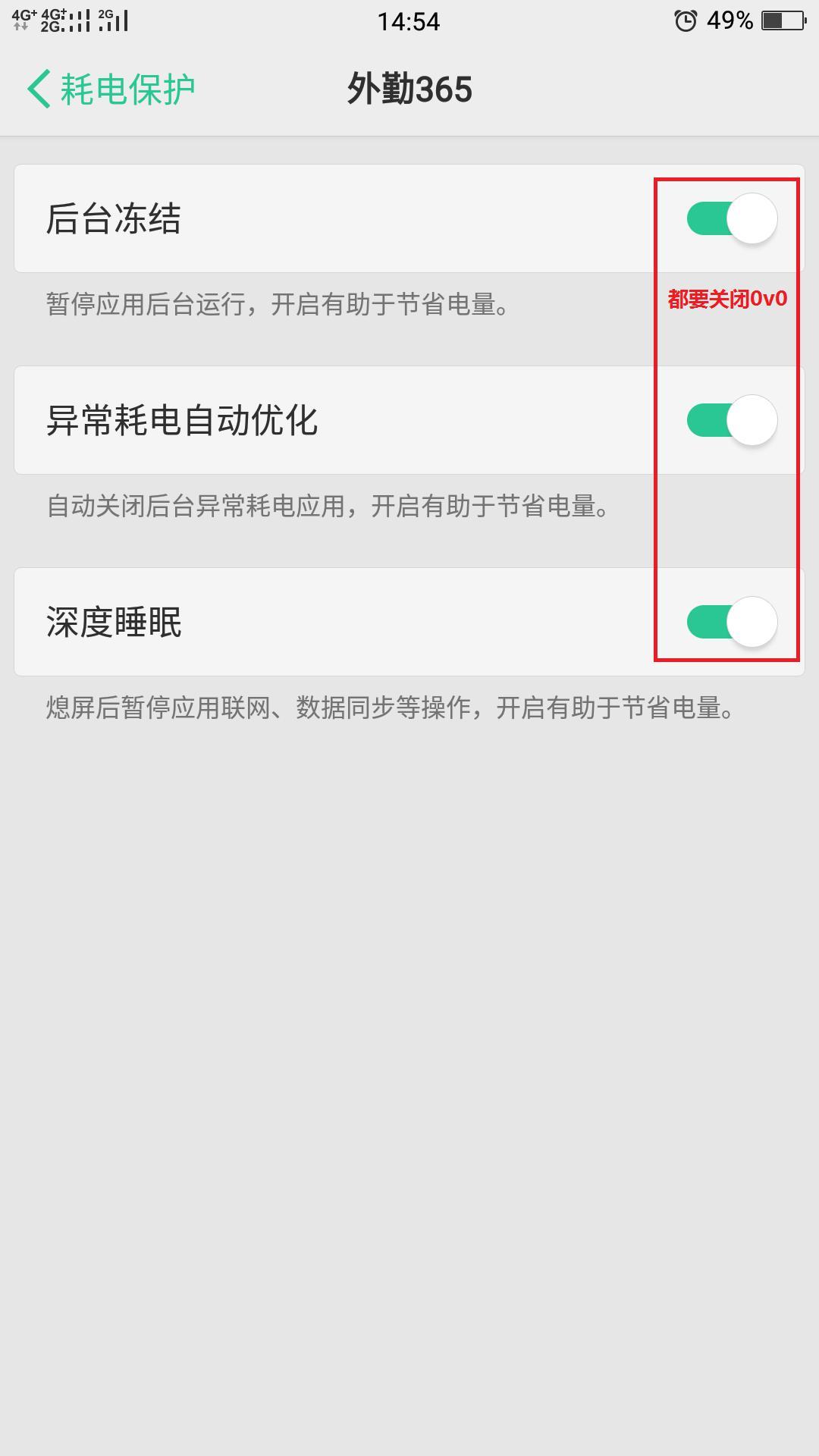 四.电池—在耗电保护中找到外勤365—将后台冻结检查异常自动优化和深度睡眠都关闭