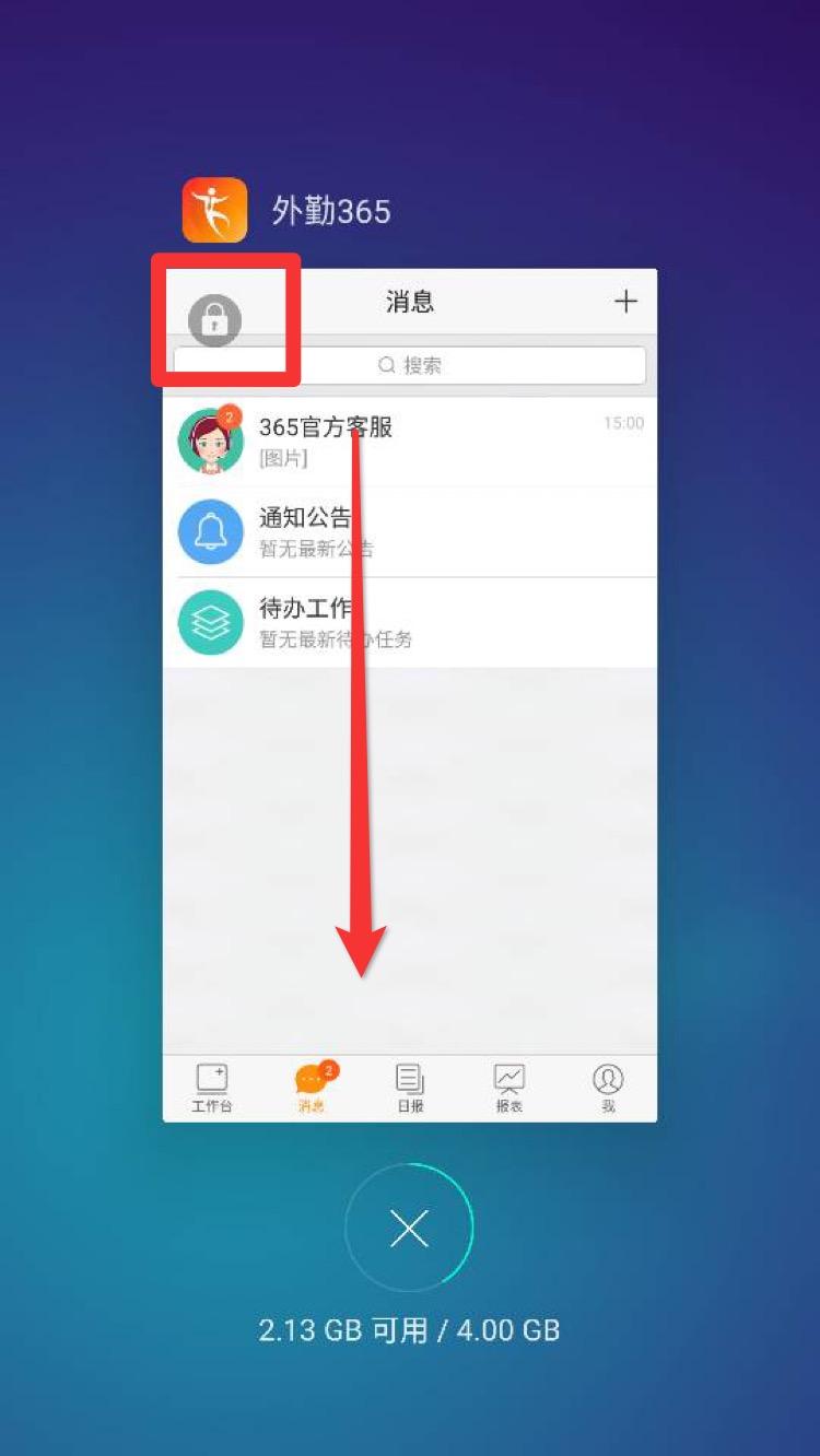 找到外勤365.按住往下滑动,可以看到外勤365左上方出现一个小锁的图标即代表锁定。