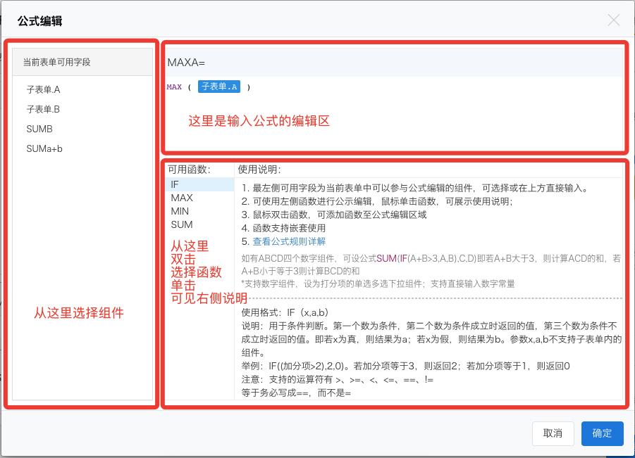 说明:用于选出一组数中最大的数。支持计算子表单内的组件。但不支持子表单和子表单外的组件混合运算。