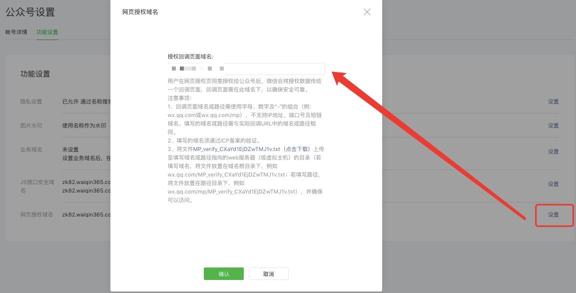 在【公众号设置】--》功能设置页面上,点击网页授权域名后的“设置“链接,弹出网页授权域名页面,把界面中的内容回填到域名文本框中,如下图: