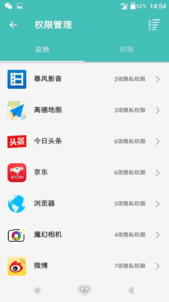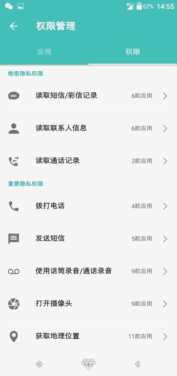 2、将外勤365加入信任设置:选择【手机助手】--【权限管理】---【应用】或【权限】---找到【外勤365】--打开【软件权限】