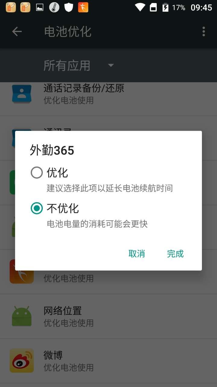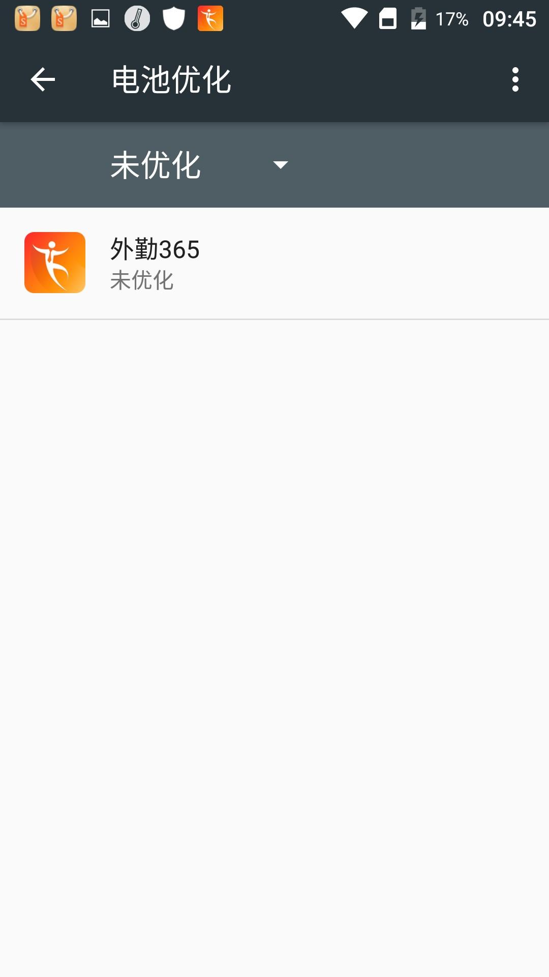 2).设置—点击‘电池’---选择右上角 ‘ ’---点击 ‘电池优化’----点开‘ ’---选择‘所有应用’----找到 ‘外勤365’----选择‘不优化’