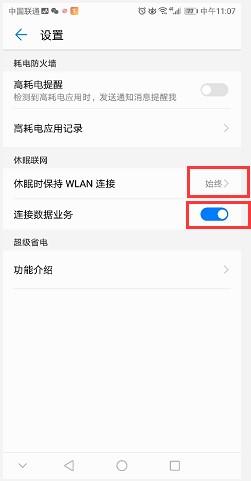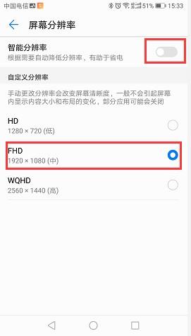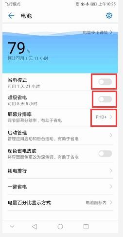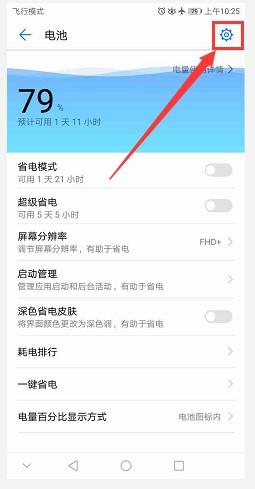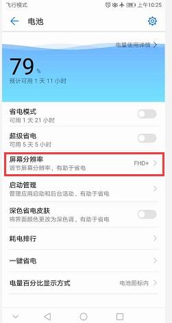 3、点击电池-关闭省电模式、超级省电,点击屏幕分辨率关闭智能分辨率,分辨率选择FHD。点击右上角小齿轮,设置界面将休眠时保持WLAN连接改为始终,打开连接数据业务。