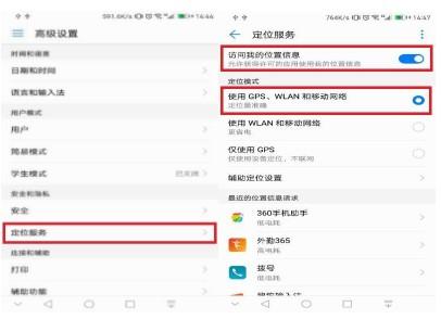 6、手机设置-高级设置-定位服务-打开 访问我的位置信息,定位模式选择使用GPS、WLAN和移动网络。