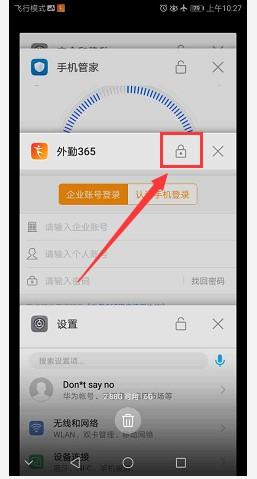 7、点击手机屏幕上的 方块键-找到外勤365,点击锁住进程。
