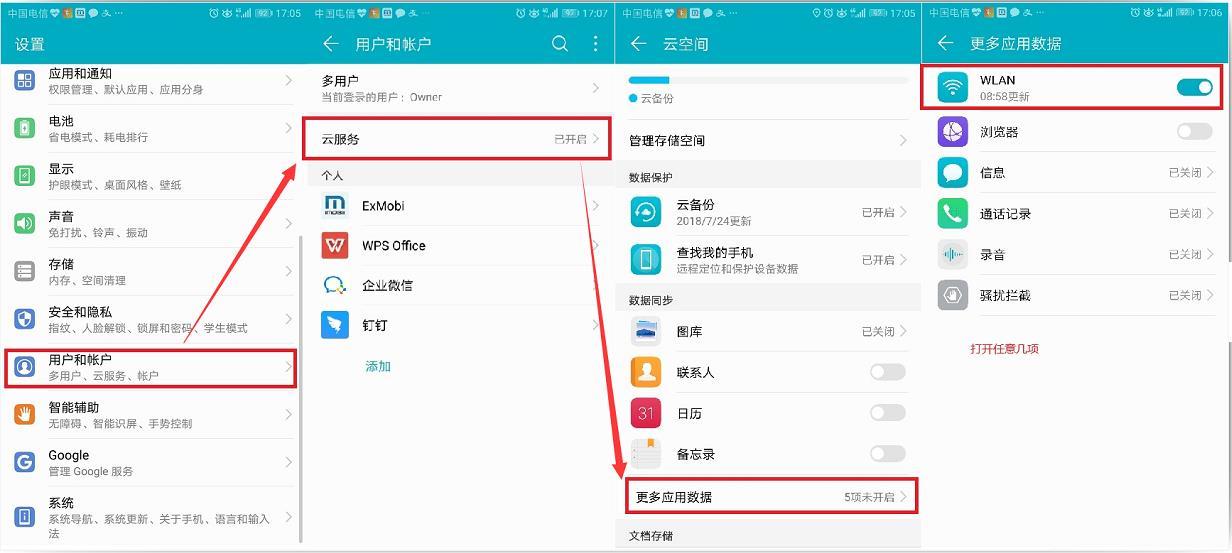 9、手机设置--用户和账号--云服务--更多应用数据--打开wifi更新,打开任意一项数据更新
