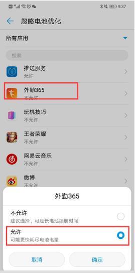 10、手机设置里 搜索--电池--忽略电池优化--选择所有应用--找到外勤365--设置为允许忽略电池优化