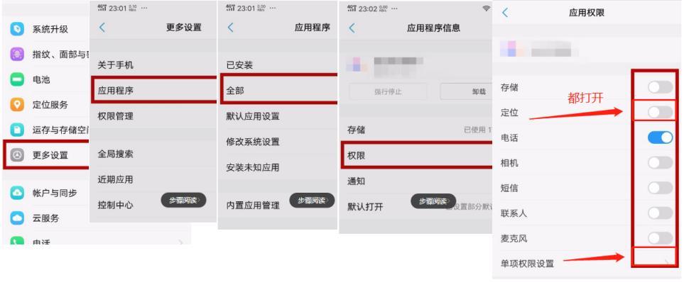 3、手机【设置】--【更多设置】--【应用程序】--【全部】--【外勤365】--【权限】--开启定位和单项权限设置