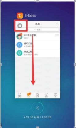7、点击屏幕左下角的虚拟框框键,即可查看后台打开的程序,在这个界面,将外勤365往下滑上锁