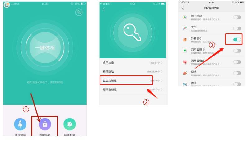 1、打开【手机管家】,点击【权限隐私】--【自启动管理】--外勤365打开,如图: