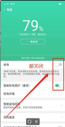 2、打开【设置】,点击【电池】,关闭【省电】和【智能耗电保护】,【应用速冻】,关闭【外勤365】