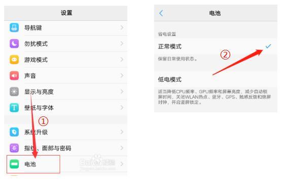 1、打开【设置】,点击【电池】--选择【正常模式】