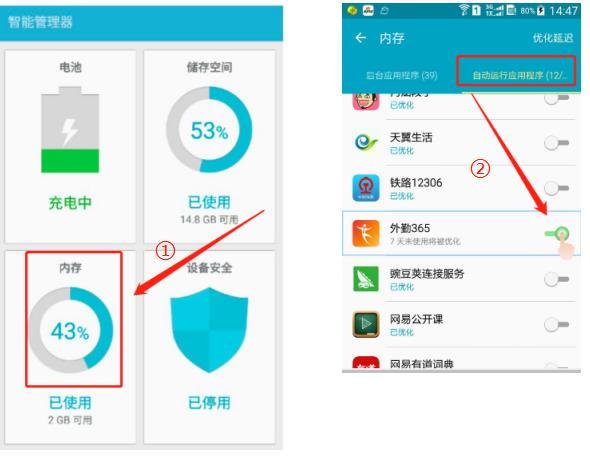 4、打开【智能管理器】--【内存】--选择【自启动应用程序】--找到【外勤365】设置允许