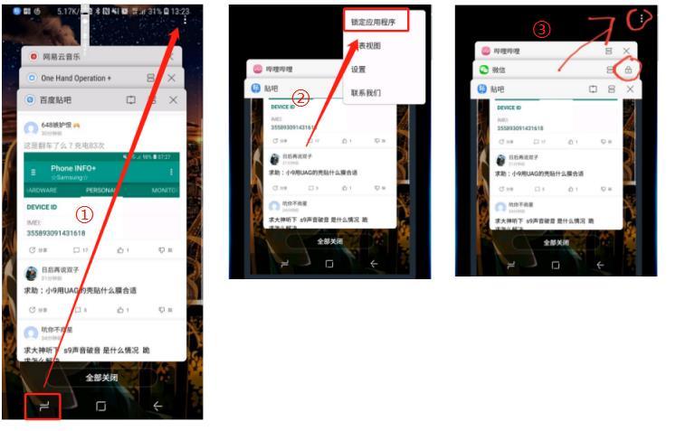 6、点击手机屏幕左下角菜单键,即可查看后台打开的程序,选择外勤365卡片,点击右上角“三点图标”,选择【锁定应用程序】