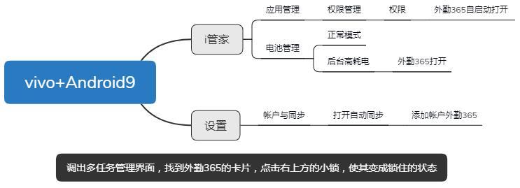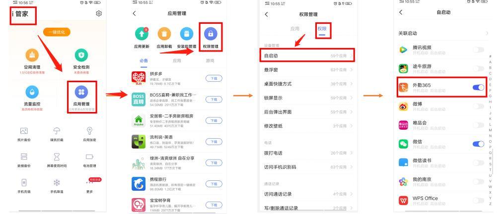 1.打开vivo自带的i管家,点击 应用管理-权限管理-权限-自启动-外勤365(打开)