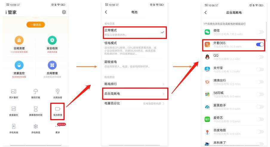 2.打开vivo自带的i管家,点击 电池管理,选择正常模式,点击后台高耗电-外勤365(打开)