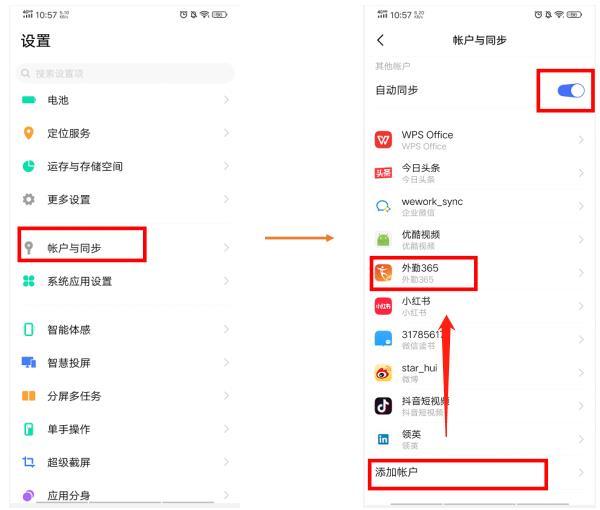 3.打开vivo系统的设置-账户与同步,打开自动同步,点击添加账户-外勤365