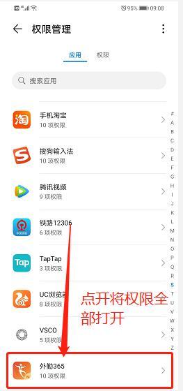 3、在【权限管理】中找到外勤365,将权限全部打开。