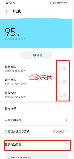 4、在手机设置里面找到【电池】模块,关闭省电模式,【更多电池设置】里面将【休眠时保持网络数据连接】打开。