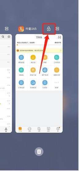 8、调出手机后台多任务界面,点击下方方块键或者从屏幕下方上滑,找到外勤365卡片,下拉上锁。