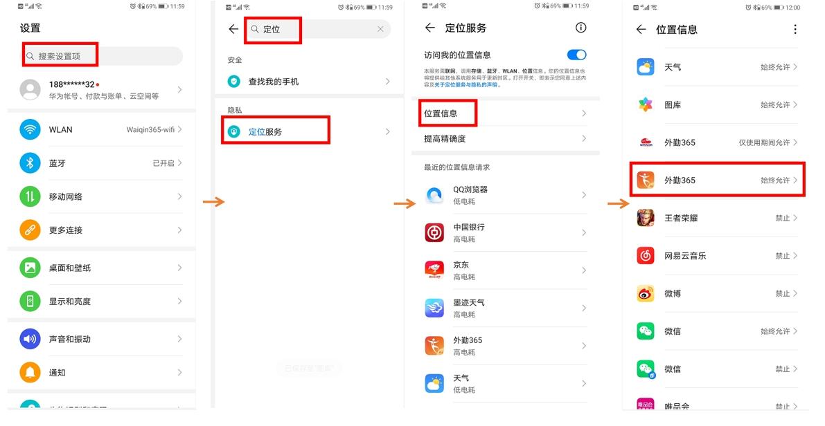 7、手机上方搜索框输入【定位服务】搜索下,将外勤365设置为始终允许