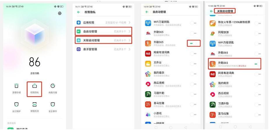 1、开启手机管家中的权限隐私,打开自启动管理中的外勤365和关联启动中的外勤365。