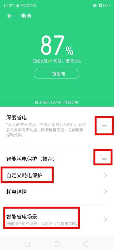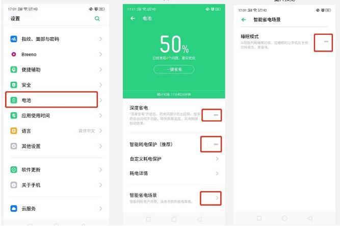 2、点开手机设置中的电池关闭深度省电、智能耗电保护、智能省电中的睡眠模式和应用速冻中的外勤365关闭。