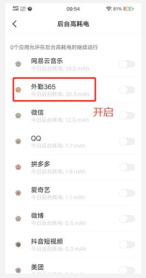 2打开vivo自带的i管家,点击 电池管理,选择正常模式,点击后台高耗电-外勤365(打开)
