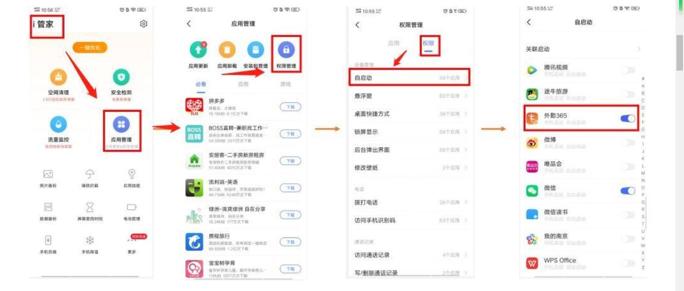 1.打开vivo自带的i管家,点击 应用管理-权限管理-权限-自启动-外勤365(打开)