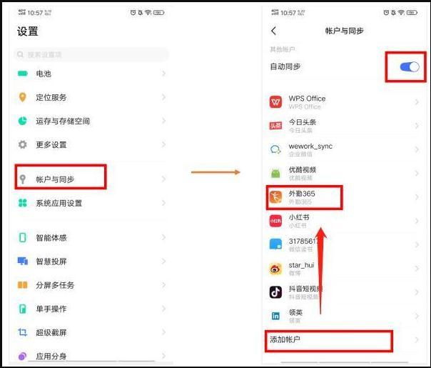 4.打开vivo系统的设置-账户与同步,打开自动同步,点击添加账户-外勤365