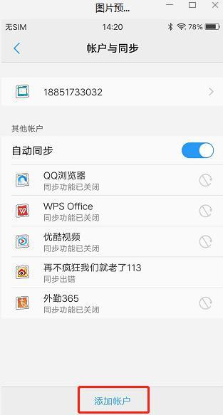 6. 打开vivo系统的设置-账户与同步,打开自动同步,点击添加账户-外勤365