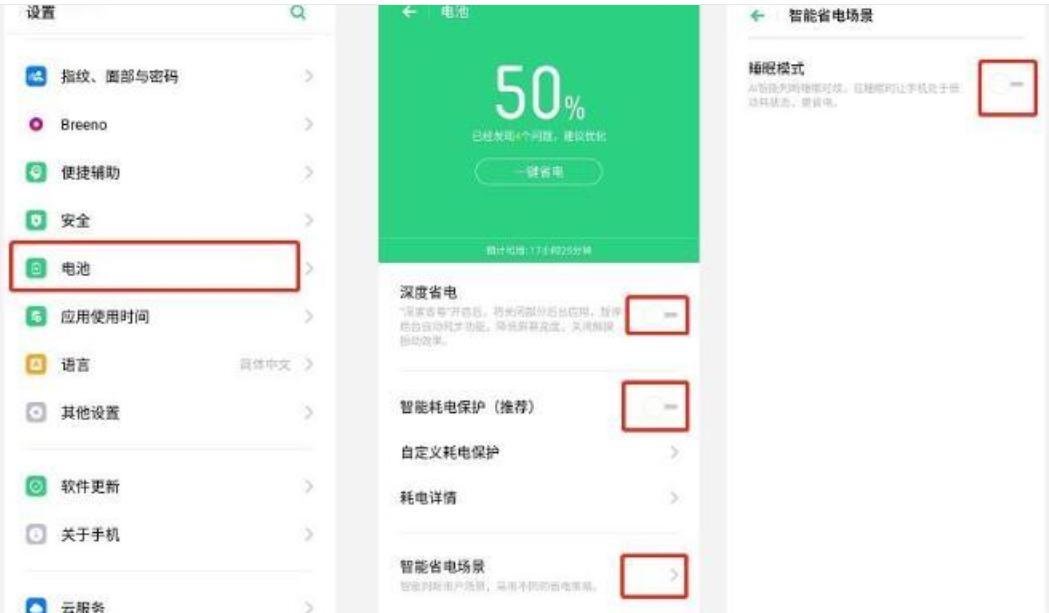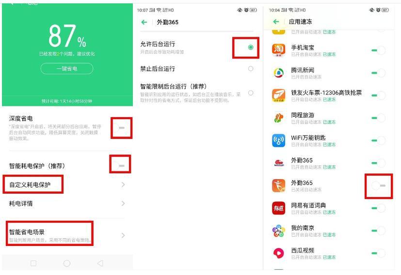 2点开手机设置中的电池关闭深度省电、智能耗电保护、智能省电中的睡眠模式和应用速冻中的外勤365关闭。