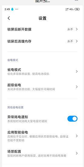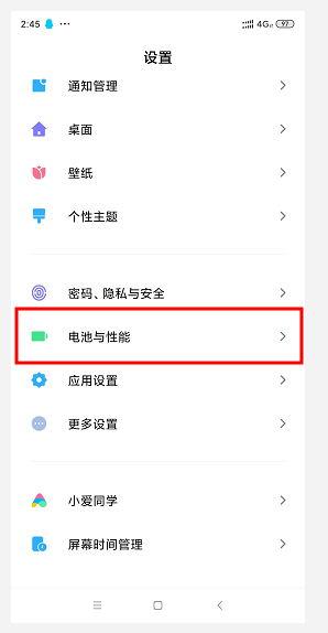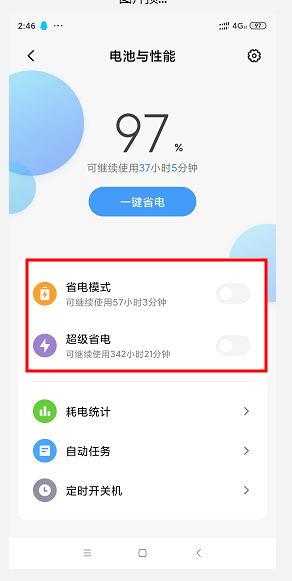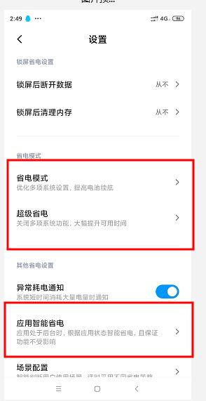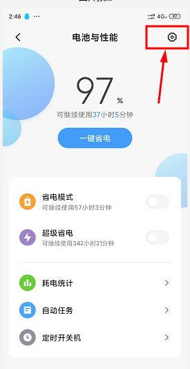 一、找到手机中的设置-》电池与性能-》关闭省电模式、超级省电-》右上角小齿轮按钮