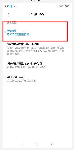 锁屏后断开数据、锁屏后清理内存选择从不-》关闭省电模式、超级省电-》点击应用智能省电模式搜索外勤365-》选择无限制