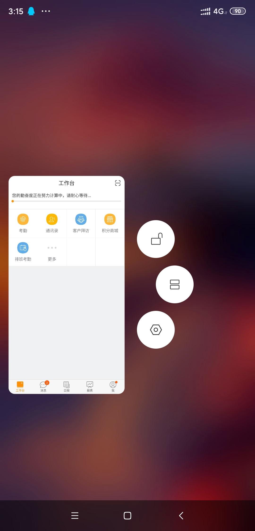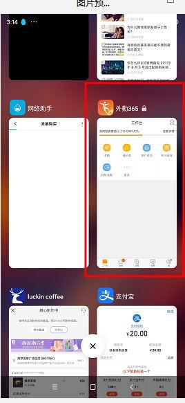 三、切换到“最近任务”界面(从屏幕底部上滑并停顿一下,或者点击三条横线那个图标),然后长按外勤365这个卡片,上锁(如下图)