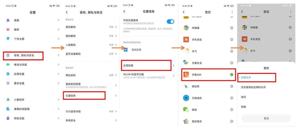 四.手机设置中,【密码、隐私与安全】—【位置信息】—找到外勤365—设置为【总是允许】