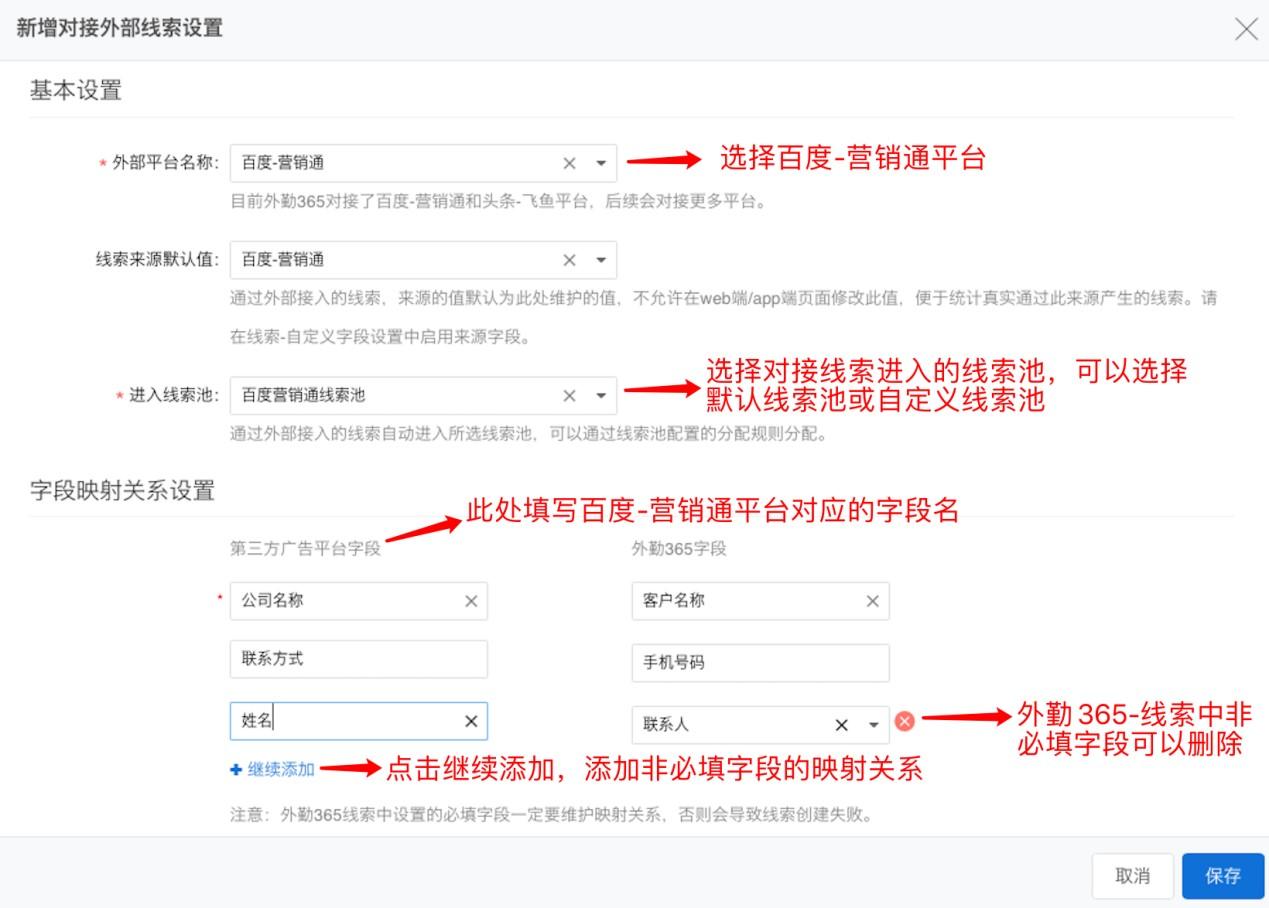 映射关系设置:此处的映射字段名就是在外勤365端需要维护的第三方广告平台字段。百度营销通限制至少要选两个标准字段,可以根据需求自行设置,若标准字段都不需要同步给外勤365可以选择任意两个字段,在外勤365端配置映射关系时不配置即可。