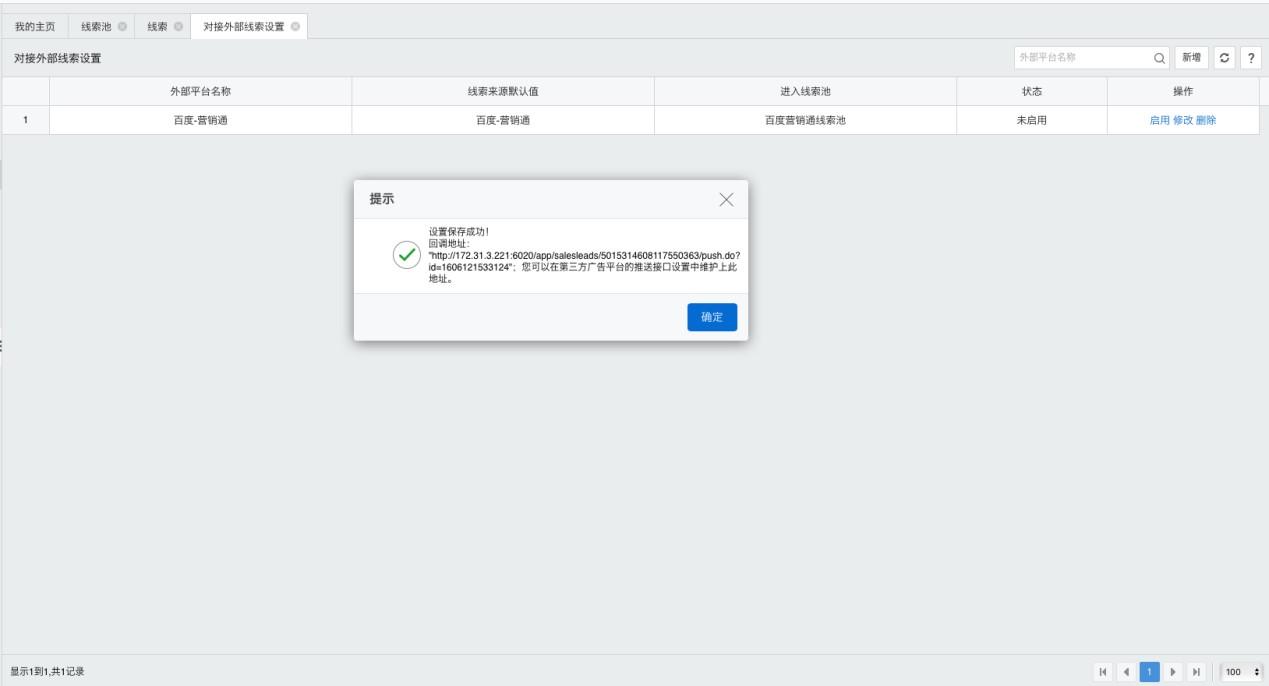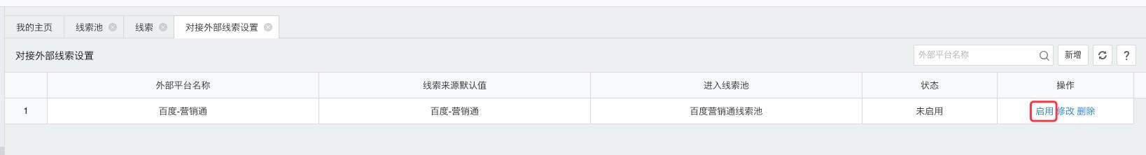 3、在外勤-365端启用对接百度-营销通平台线索配置:点击启用按钮