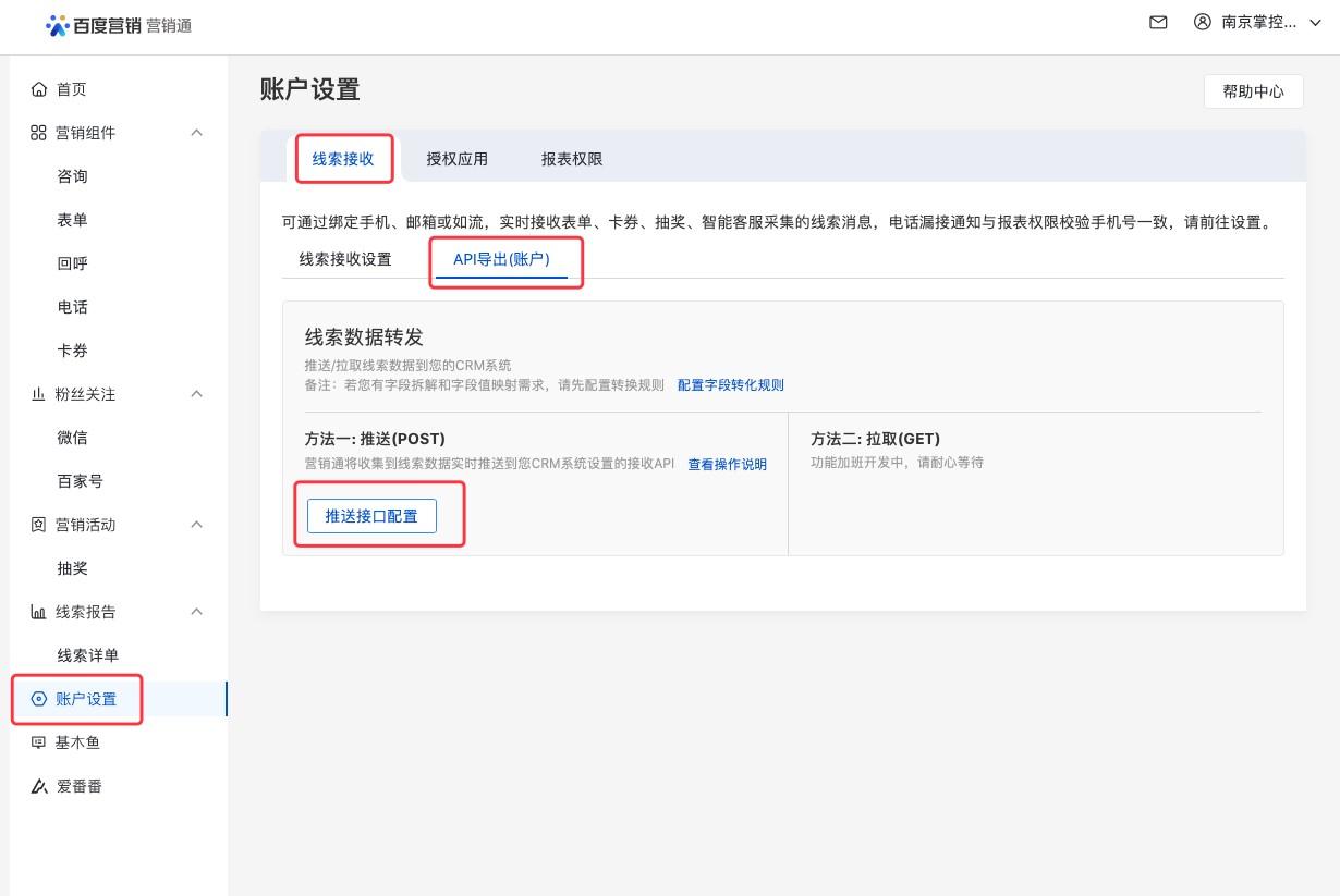 点开账户设置-线索接受-API导出(账户)-推送接口配置