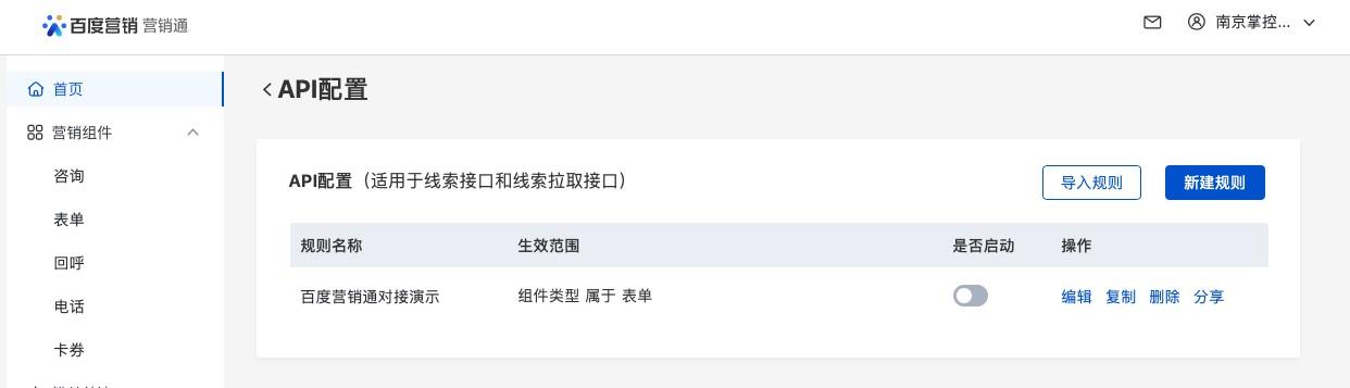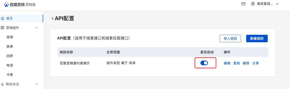 5、测试完成后,可以在百度-营销通端开启配置,开启配置后对接接口生效,通过百度-营销通收集的线索将会根据配置进入外勤365相应的线索池。