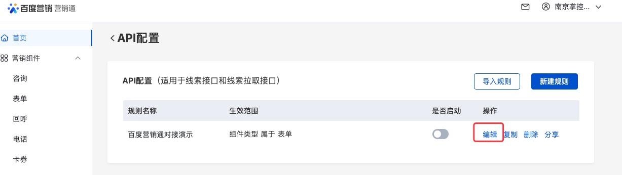 4、在百度-营销通端进行接口测试:找到对应的API配置,点击编辑按钮