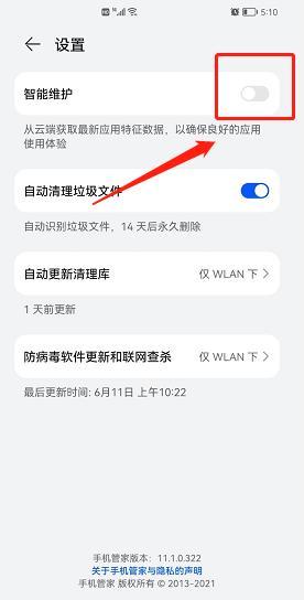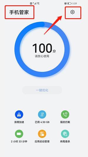 1、打开华为手机自带的【手机管家】,点击右上角【小齿轮】,关闭【智能维护功能】