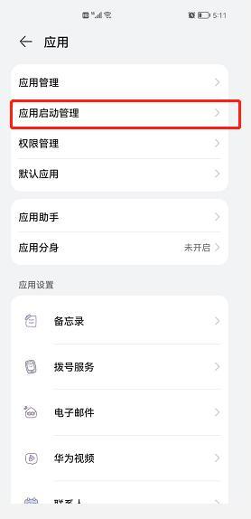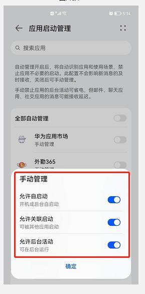 2、手机设置里面找到【应用】模块,打开【应用启动管理】,找到外勤365,【关闭】自动管理,跳出的弹窗全部打开。