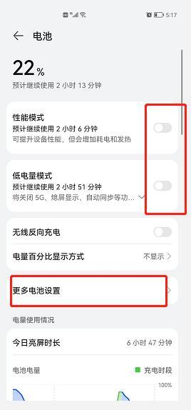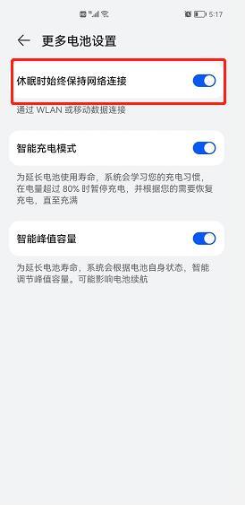 4、在手机设置里面找到【电池】模块,关闭省电模式,【更多电池设置】里面将【休眠时保持网络数据连接】打开。