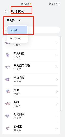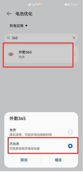6、手机设置最上方搜索框输入【电池优化】搜索下,左上角切换为【全部应用】,找到外勤365,设置为【不允许】。