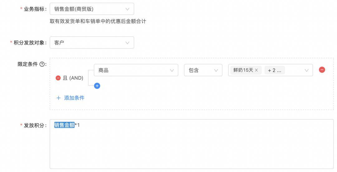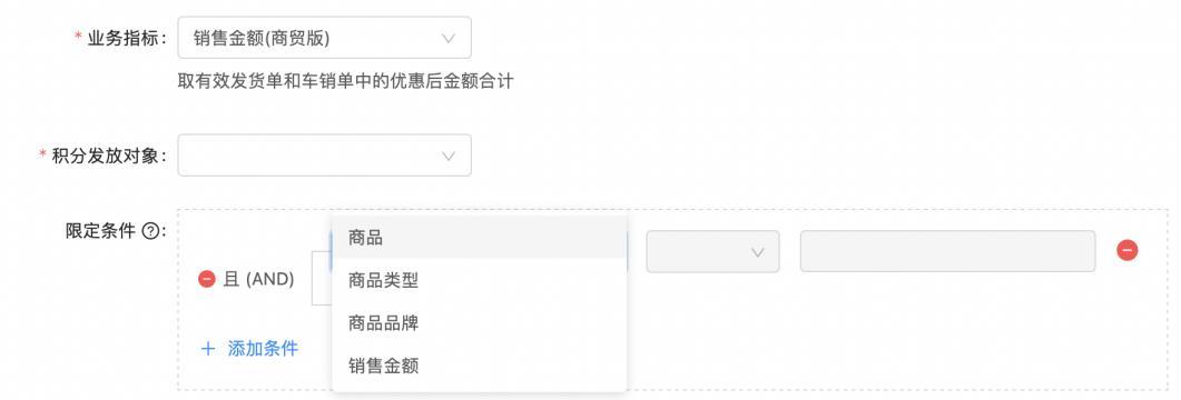 l 限定条件,根据业务指标不同,可选择对应的积分发放的限定条件。如销售金额指标,限定到商品/类型/品牌签等,如下图: