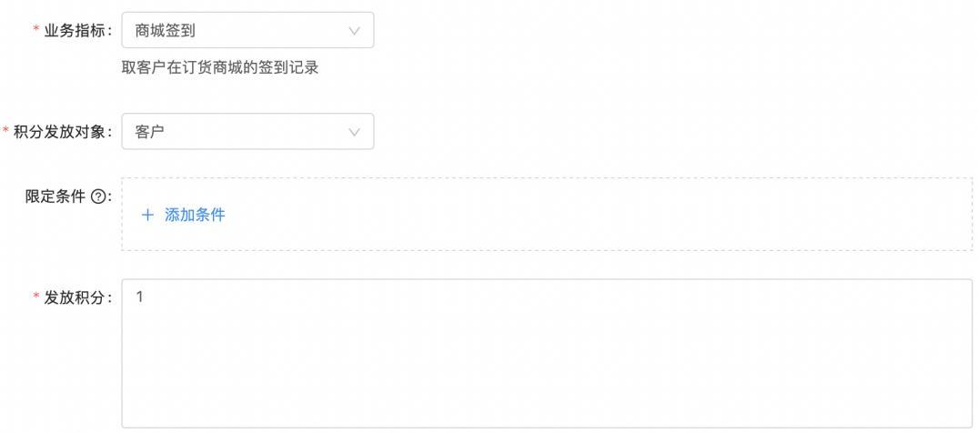 举例2:某公司为提升客户在订货商城订货的活跃度,鼓励客户每天在订货商城签到,每签到1次,奖励1个积分,则设置积分规则如下: