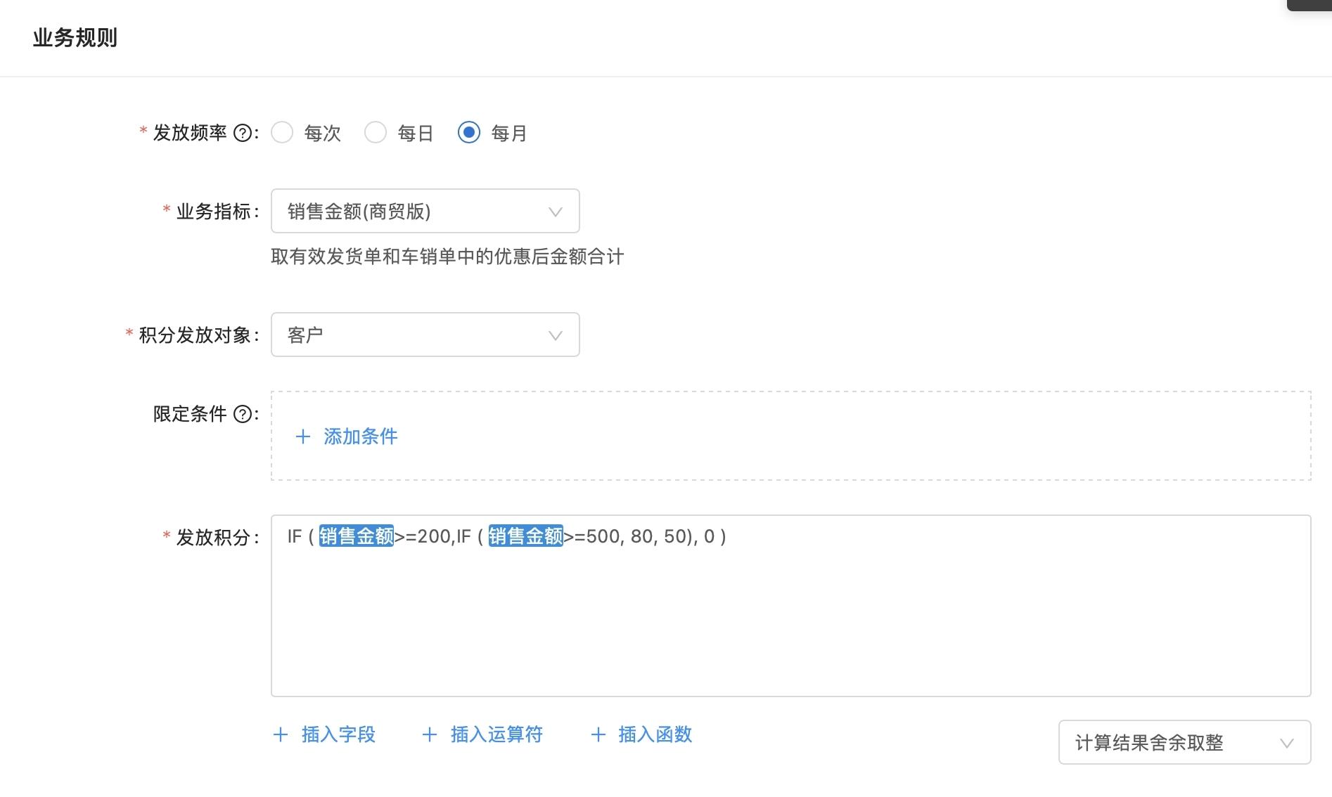 举例3:某公司双11促销活动,客户在订货商城下单,一个月订单金额大于等于200元,奖励50积分,一个月订单金额大于等于500元,奖励80积分。则积分规则设置如下: