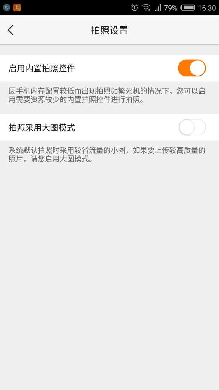 使用拍照功能时,可以使用客户端内置的拍照控件进行拍照,可避免因手机内存小而导致客户端崩溃的问题。